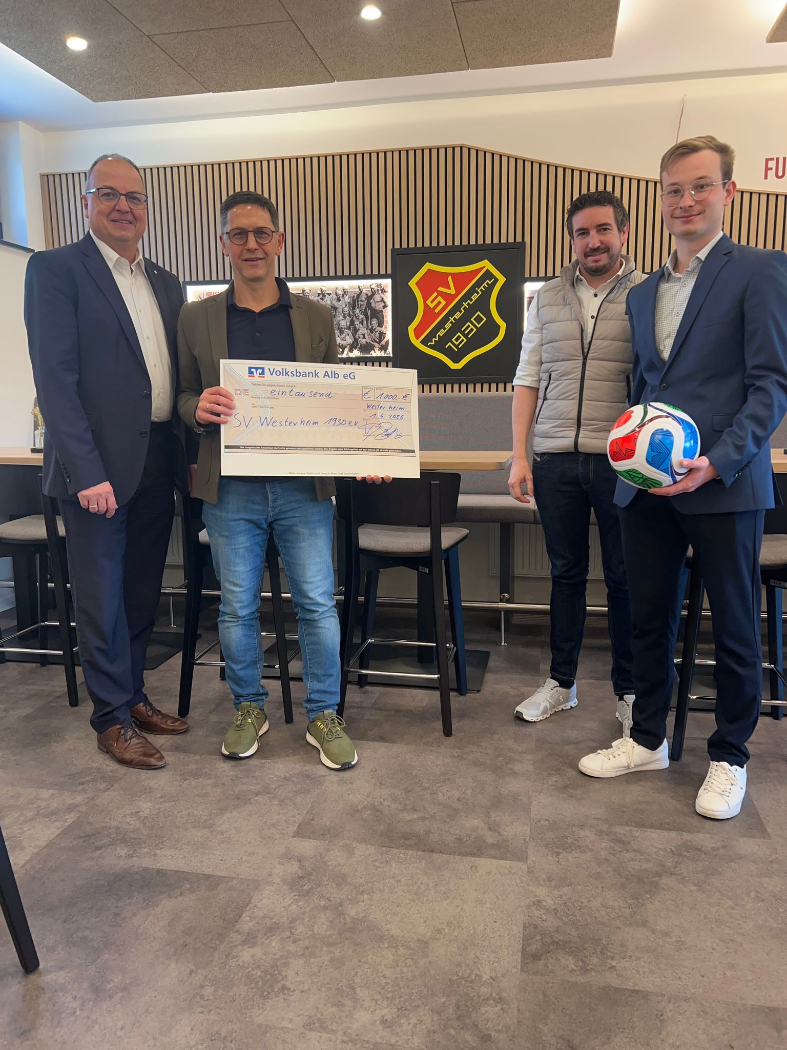 Die Volksbank Alb hat die Modernisierung des Sportheims begleitet und unterstützt. Bei einem Besuch im neuen Sportheim konnten sich die beiden Vorstände Herr Vogl und Herr Höß von der gelungenen Maßnahme überzeugen. Bei dieser Gelegenheit überreichten sie den SVW Vorständen Rieck und Volles einen Scheck über 1000 €. Vielen Dank dafür.