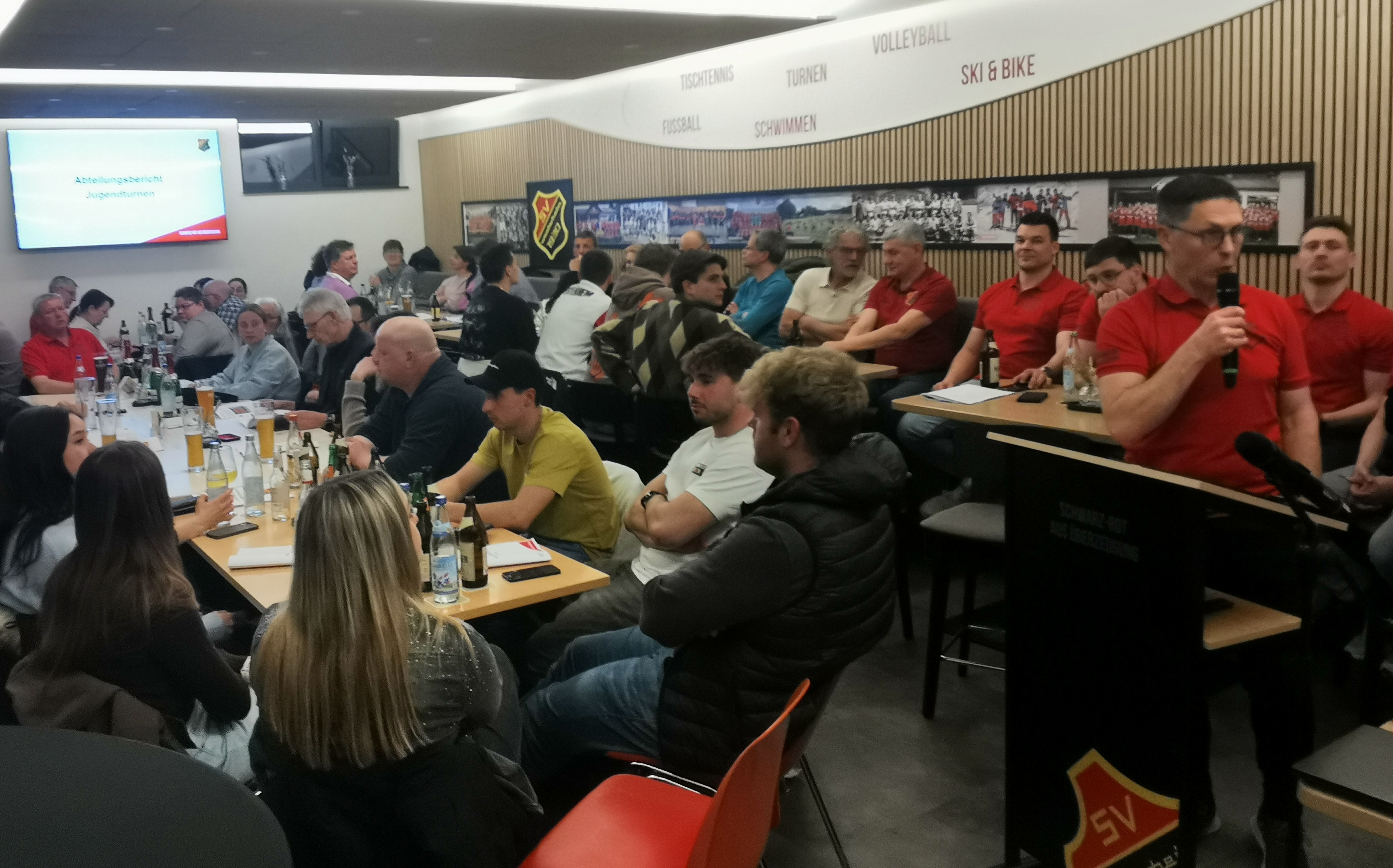 Daniel Volles gab einen Rückblick auf die Veranstaltungen im abgelaufenen Jahr wie Fitness Convention, Tabaluga Revival, 50 Jahre Schwimmabteilung & Alb-Bad, Sportwochenende, Schlachtfest und Jahresfeier. Rieck berichtete über den Verlauf der gelungenen Sportheimmodernisierung.