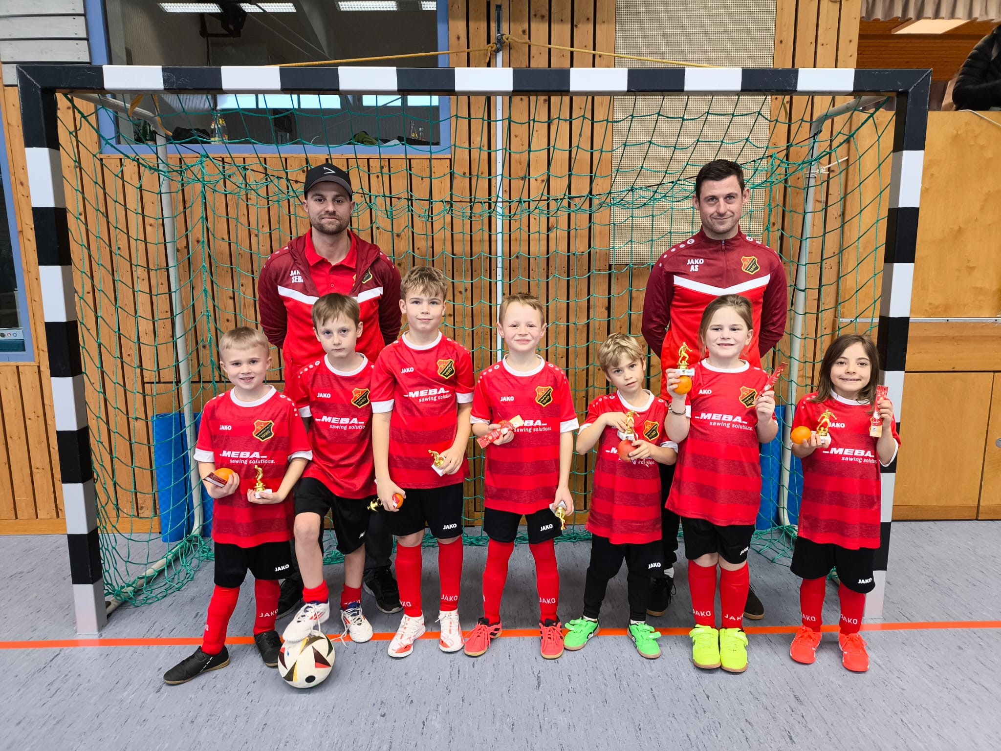 (Andreas) Die Mannschaften der F-Jugend starteten am vergangenen Samstag den 06.12.2025 mit dem ersten Turnier in die Hallenrunde in Heroldstatt. Morgens ging es für den jüngeren Jahrgang los, leicht Personell geschwächt stellten sich die jungen Kicker den anderen Mannschaften. Zum glück halfen zwei Spieler des älteren Jahrganges aus, dadurch hatten wir zwar genug Kinder für unser Team aber auch keinen Auswechselspieler. In sechs zum Teil hart umkämpften Partien vielen einige Tore, alle Kinder waren nach dem letzten Spiel recht erleichtert das das Turnier zu ende war. Da die fehlenden Pausen während den Partien ihr Spuren hinterließen. Bei der darauffolgenden Siegerehrung überreichte sogar der Nikolaus die Pokale und jedes Kind durfte sich noch Obst und Schokolade aus dem Sack nehmen.