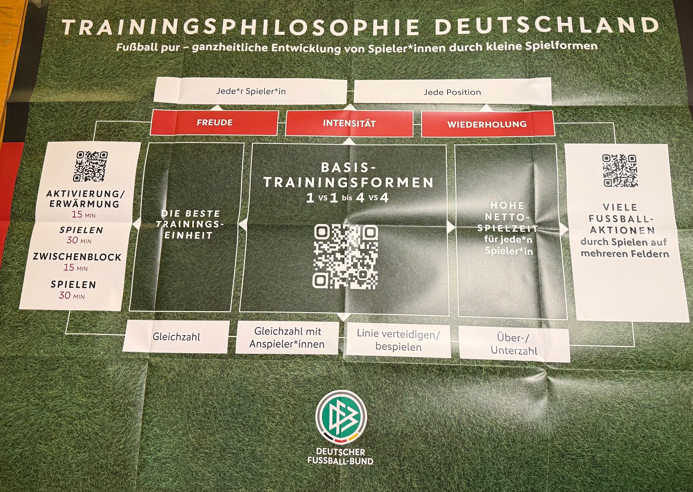 Im weiteren Verlauf der Einheit wurde viel gespielt – auf kleine Tore, ohne feste Torhüter, sodass jedes Kind in Aktion war. Auch Umbauten auf den Feldern waren nicht nötig, da das Training clever vorbereitet war. Ein zusätzlicher Hinweis der DFB-Trainer: Alle Spielfelder sollten mit einheitlichen Farben der Hütchen markiert sein, um Orientierung und Klarheit zu schaffen. Ein weiterer Tipp: Die Kinder zählen ihre Tore selbst, um Eigenverantwortung zu fördern.